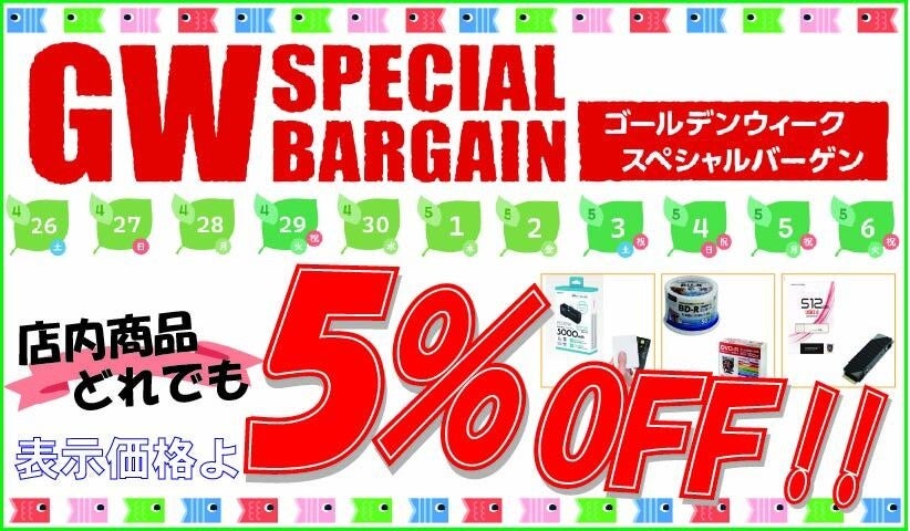 4月26日(土)より『GW限定フェア 全品5%オフセール』を開催します。