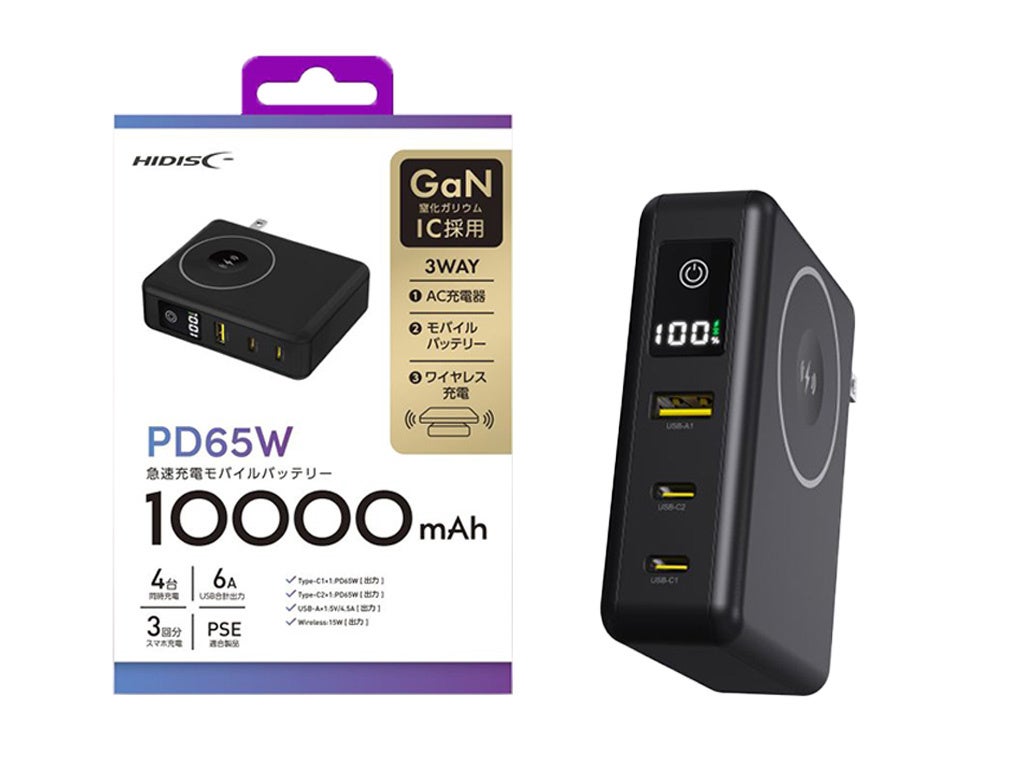 ●PD65W 10000mAh ACプラグ付 残量パーセント表示 モバイルバッテリー
