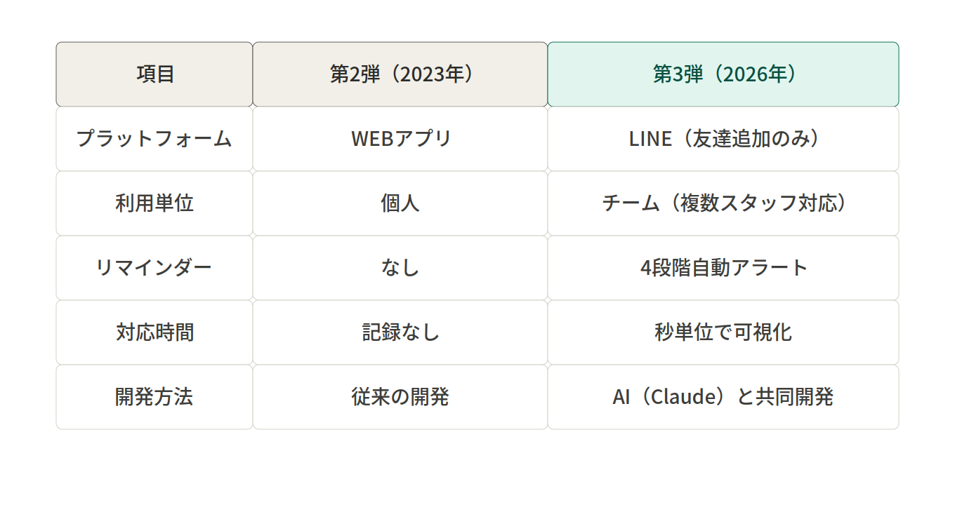 チームで使える・記録が残る・リマインダーが来る。以前の第2弾にもあった機能だが、今回は現場で本当に使い続けられるレベルに引き上げた。
