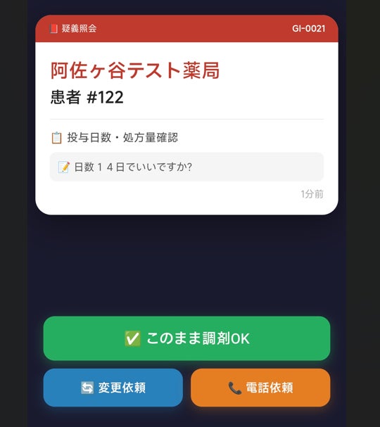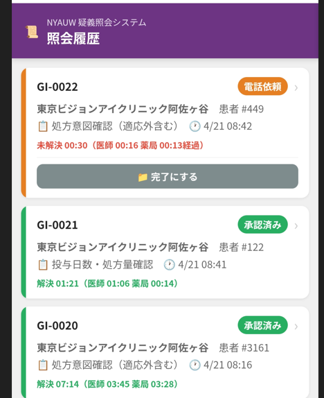 薬局側の履歴画面。赤は未解決、緑は解決済みを示し、それぞれ「医師が何分で回答したか」「薬局が何分で確認したか」「トータル何分かかったか」が秒単位で記録される。チームの対応速度が数字で見える。この数字が、現場の意識を少しずつ変えていく。