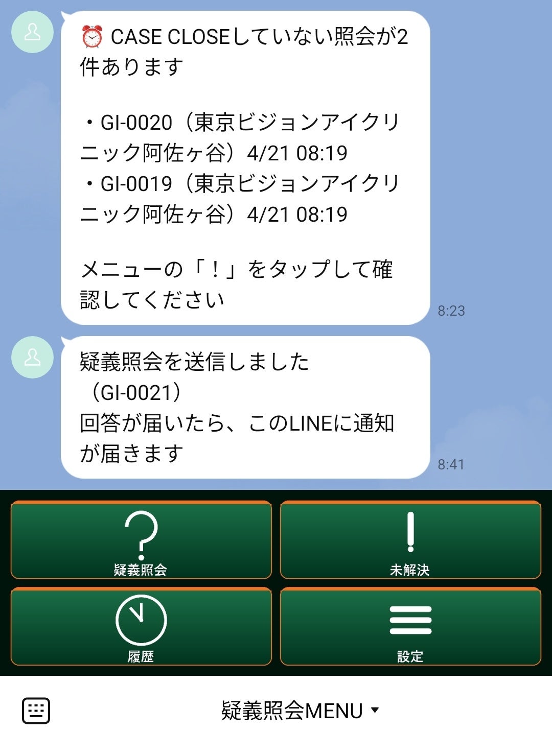 薬剤師のLINE画面。自動リマインダー(「CASE CLOSEしていない照会が2件あります」)と、照会送信の確認通知が届いている。画面下のリッチメニューから「疑義照会」「未解決」「履歴」「設定」に即アクセスできる。特別なアプリは不要。いつも使っているLINEがそのまま業務ツールになる。