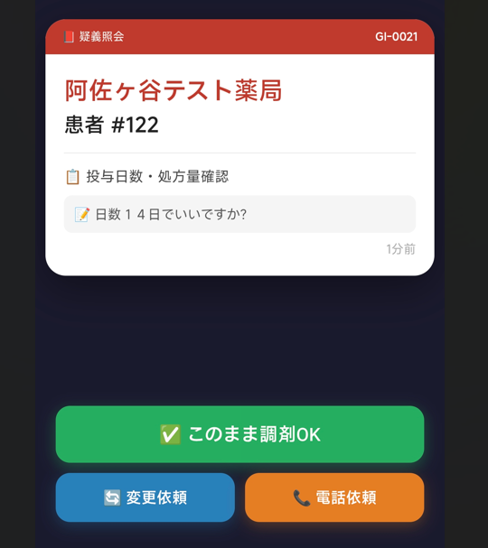 診察の合間に、スワイプひとつで返せる。回答した瞬間、薬局のLINEに通知が届く。