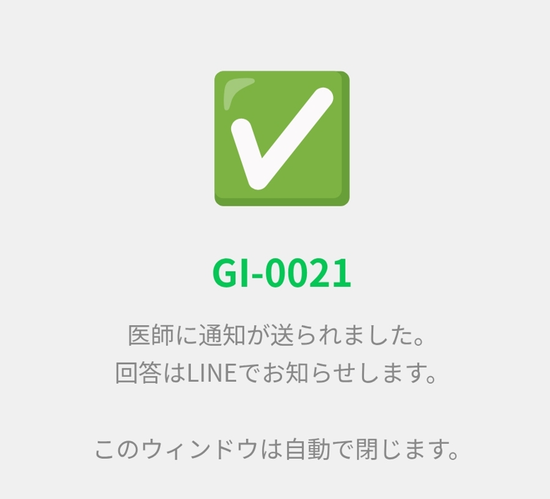 「医師に通知が送られました。回答はLINEでお知らせします。」