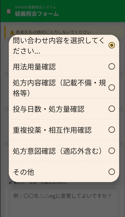 薬剤師がLINEのメニューから「疑義照会」をタップすると、このフォームが開く。用法用量・投与日数・重複投薬・処方意図など、よくある照会パターンを選択肢として用意。患者氏名は入力しない設計で、個人情報はシステムに残らない。電話をかける前に、まずこのフォームを20秒で送れる。