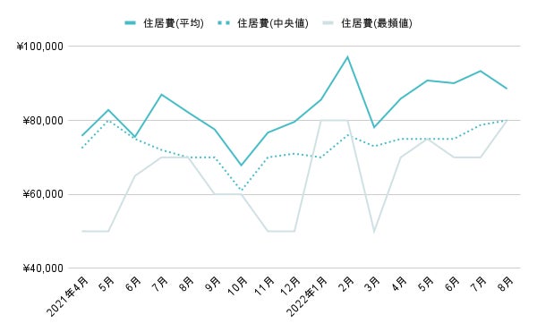 「ずっと賃貸・マンション購入 比較シミュレーション計算ツール」にて入力された現在の住居費(家賃・管理費・共益費などの合計)は、平均金額で約8.9万円、中央値は8万円でした。また、最頻値は8万円でした。
