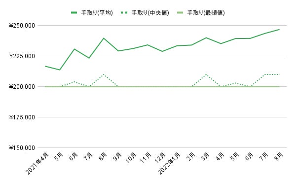 手取り額は、平均値が2022年4月以降、一貫して上昇傾向にあります。一方で最頻値は集計開始以来一貫して20万円です。