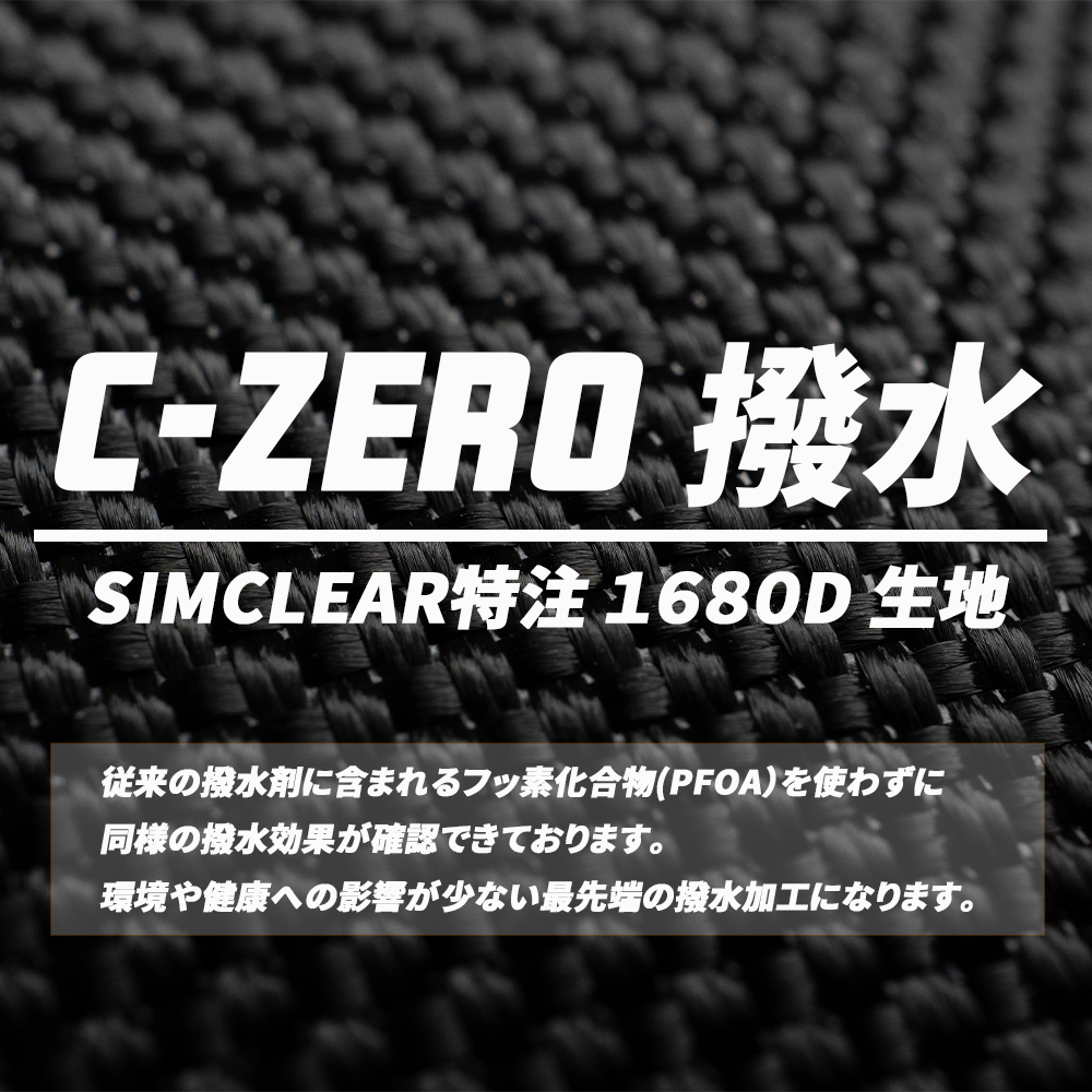 SIMCLEAR製品は生地から別注をしています。良いものを長く使ってもらうことが持続可能と考えているため、耐久性の高い1680D生地を使用しています。また世界的に規制の強まっているPFOA撥水剤も使用せずに同等の撥水効果のあるCZERO撥水加工をするため生地を特注して製作しています。