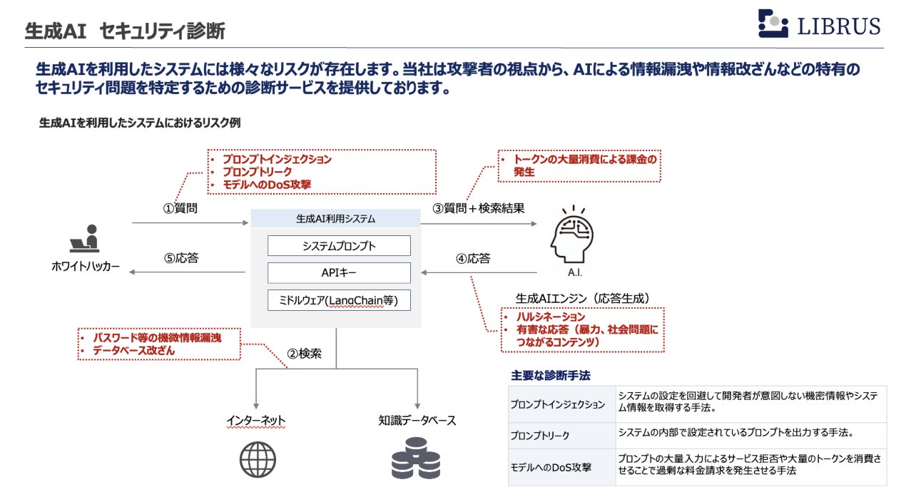 Librus株式会社(本社:東京都港区、代表取締役CEO 鎌田 光一郎、以下「当社」)は、生成AIを活用したシステムに潜むセキュリティリスクを可視化・分析する「生成AIセキュリティ診断サービス」の提供を開始したことをお知らせいたします。