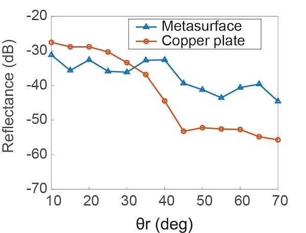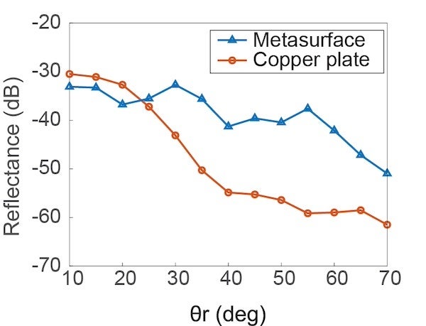 θi=0°の時30°の設計角度で、θi=10°の時40°の設計角度で電波を吸収せずに反射する金属板に比べて約10dB(10倍)の増幅が観測されました。