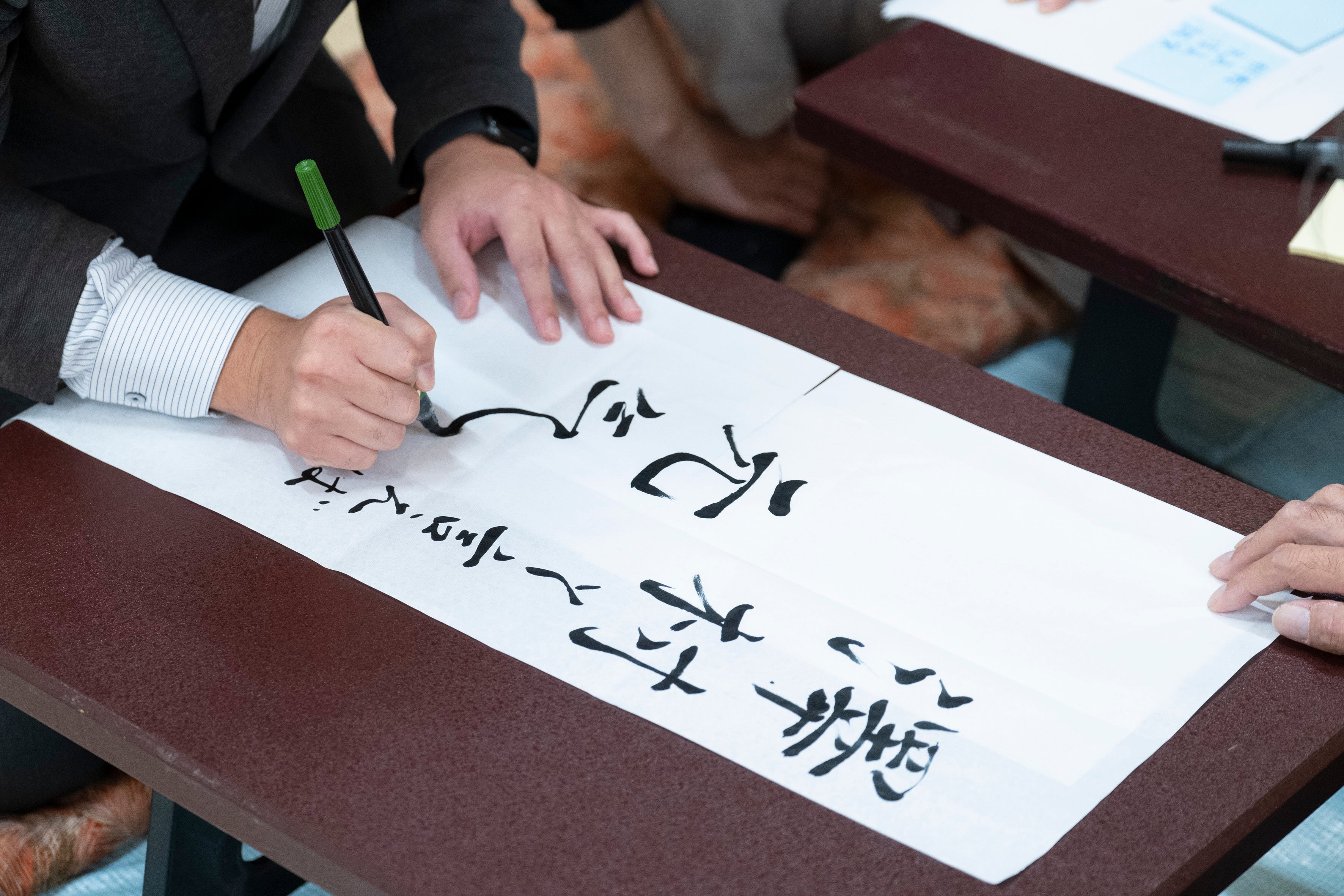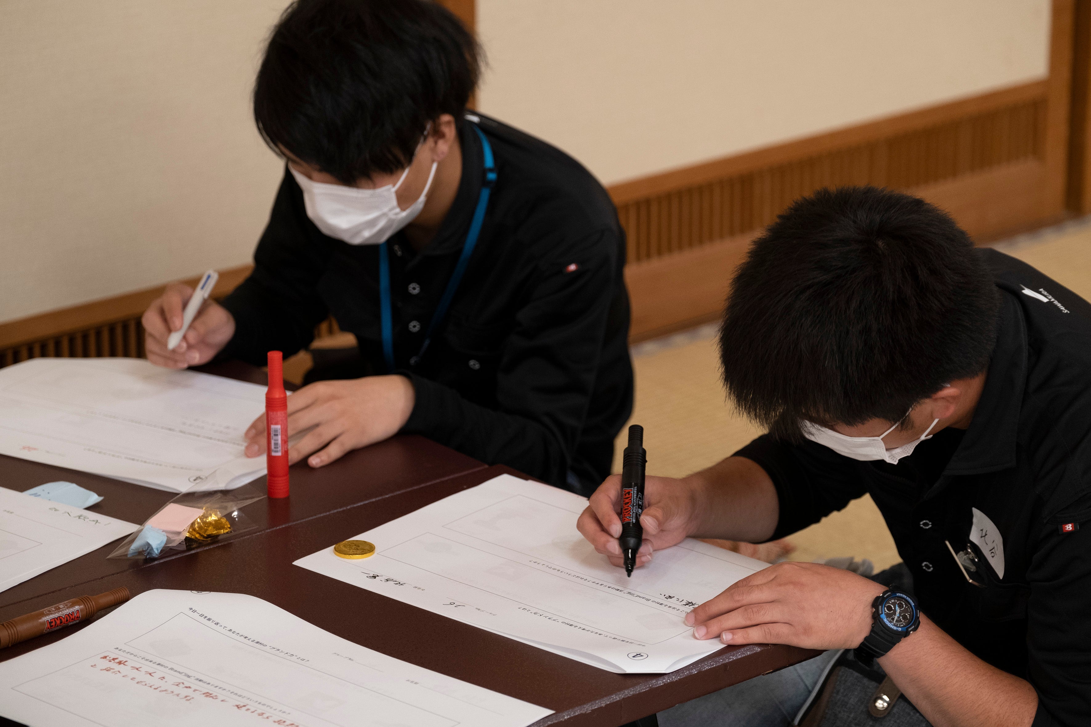 日常業務の中で、会社や個人の未来について考える機会の少ない従業員。まずは、他社や自社の魅力度を点数で評価し、価値観の異なりを分かち合いました。その後、グループごとに自社の強み・課題・伸びしろポイントを整理するワークショップを実施しました。自社の魅力や課題の共有を行った後、世代を問わず誰もが経験のある「書き初め」という体験を通して、10年後のSAWAMURAの将来像を描きました。