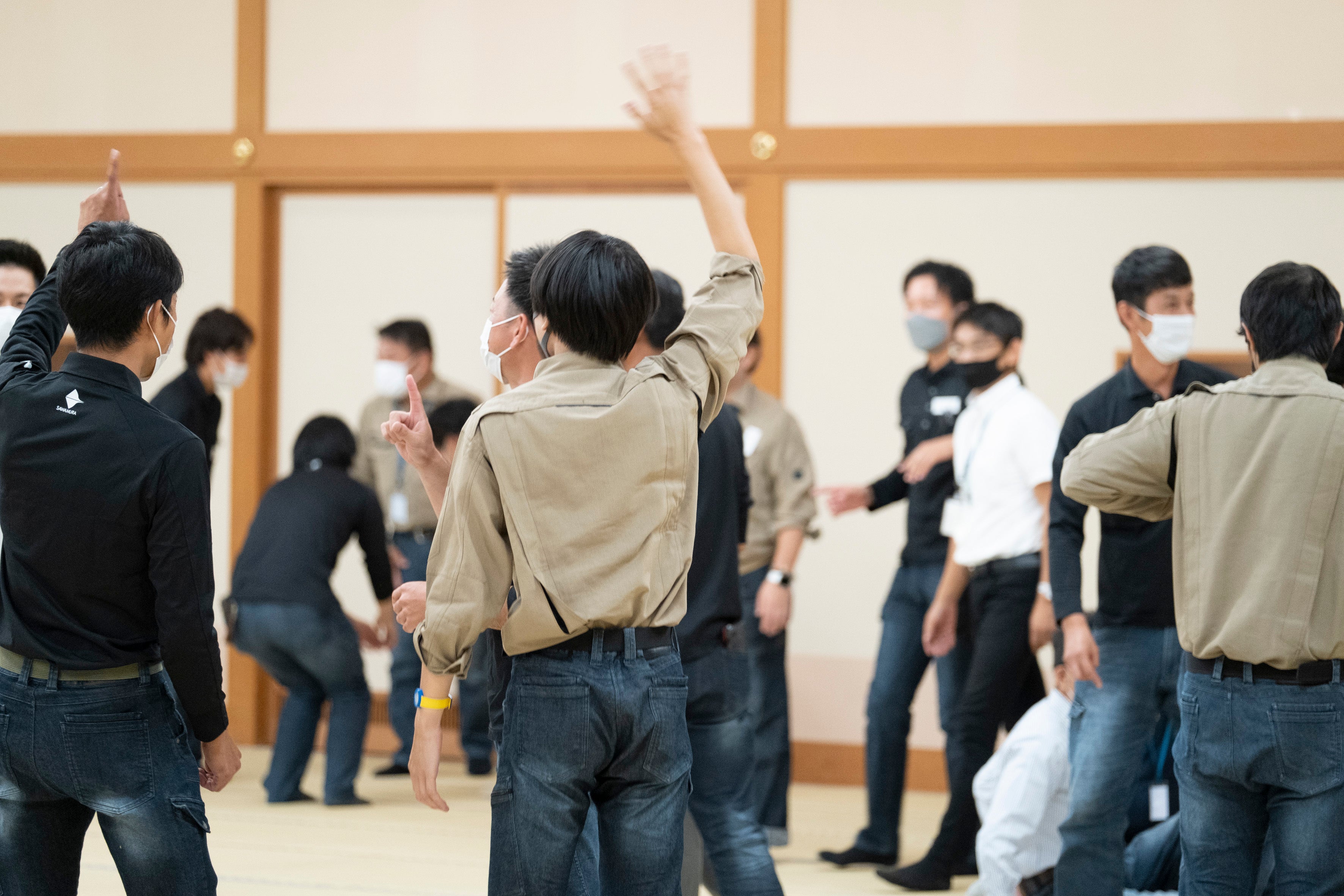 SAWAMURAの従業員は現在、約半数が入社3年以内。一方で、過去5年離職率は6%と雇用定着率が高く、勤続40年以上の従業員など、様々な社歴の従業員が入り混じっています。まずは、普段関わりの少ない社員同士の相互理解を図るため、身体を使った自己紹介のチーミングワークを実施。お互いのパーソナルな情報を知り、自然と意見交流できる場づくりを行いました。