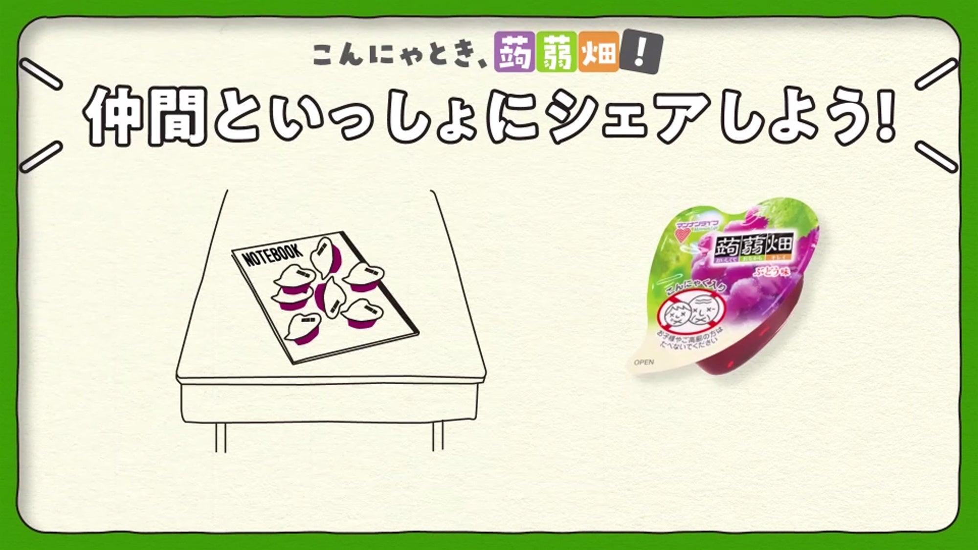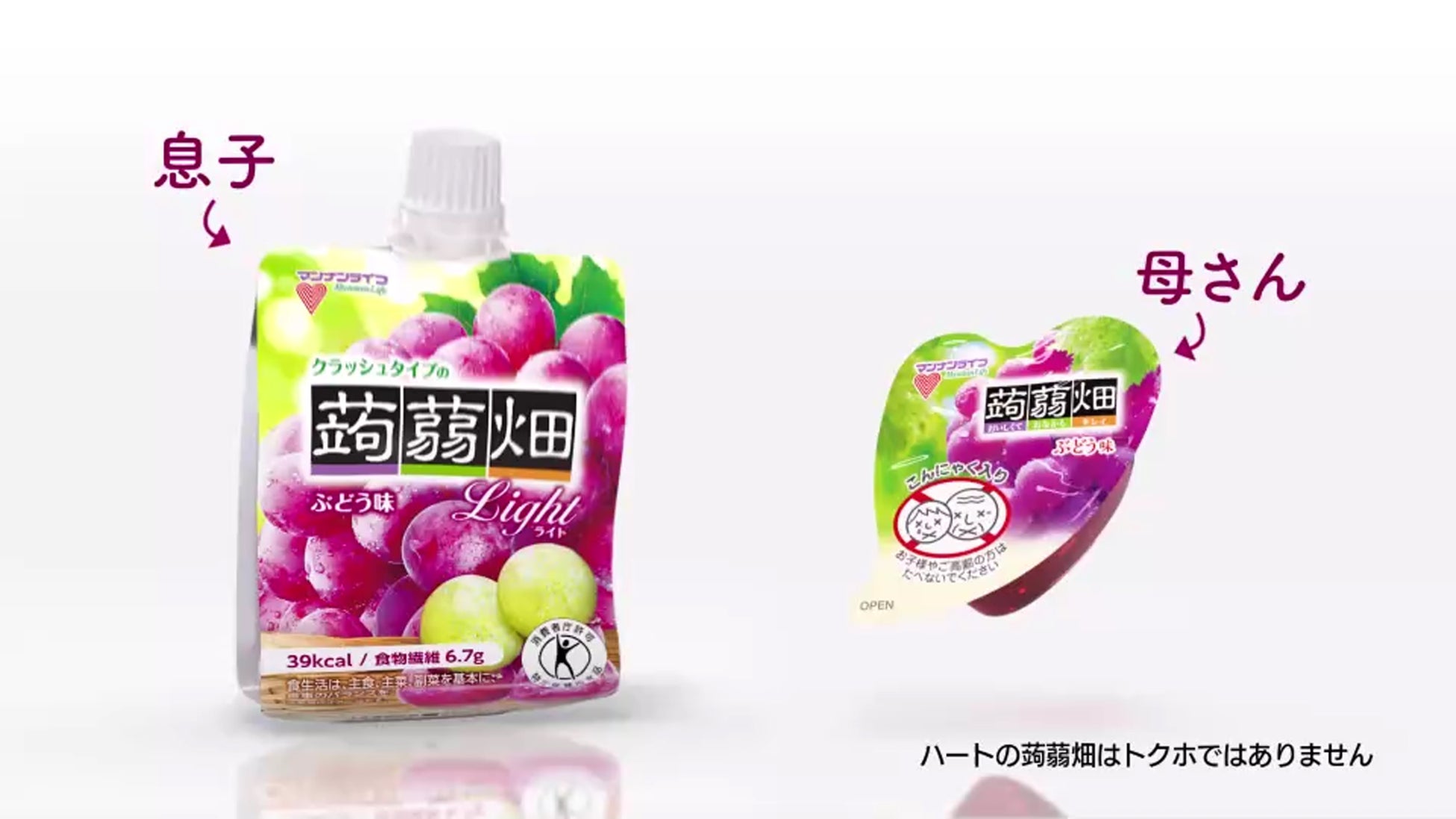 ロングセラーの『蒟蒻畑』と、手軽に食べやすい『クラッシュタイプの蒟蒻畑』が蒟蒻畑ファミリーとして、楽しいファミリートークを繰り広げます。