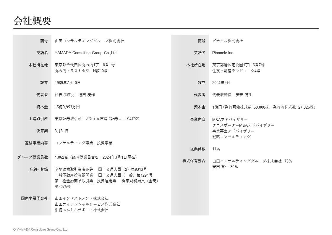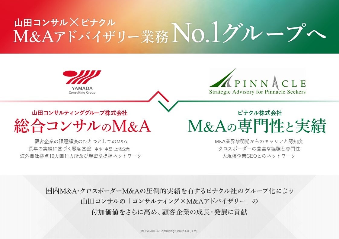 この度、山田コンサルティンググループ株式会社(本社:東京都千代田区、代表取締役社長:増田慶作、プライム市場、以下当社)は、ピナクル株式会社(本社:東京都港区、代表取締役会長 兼 社長 兼 CEO 安田育生、以下ピナクル社) の発行済み株式70%を取得し、子会社といたしました。