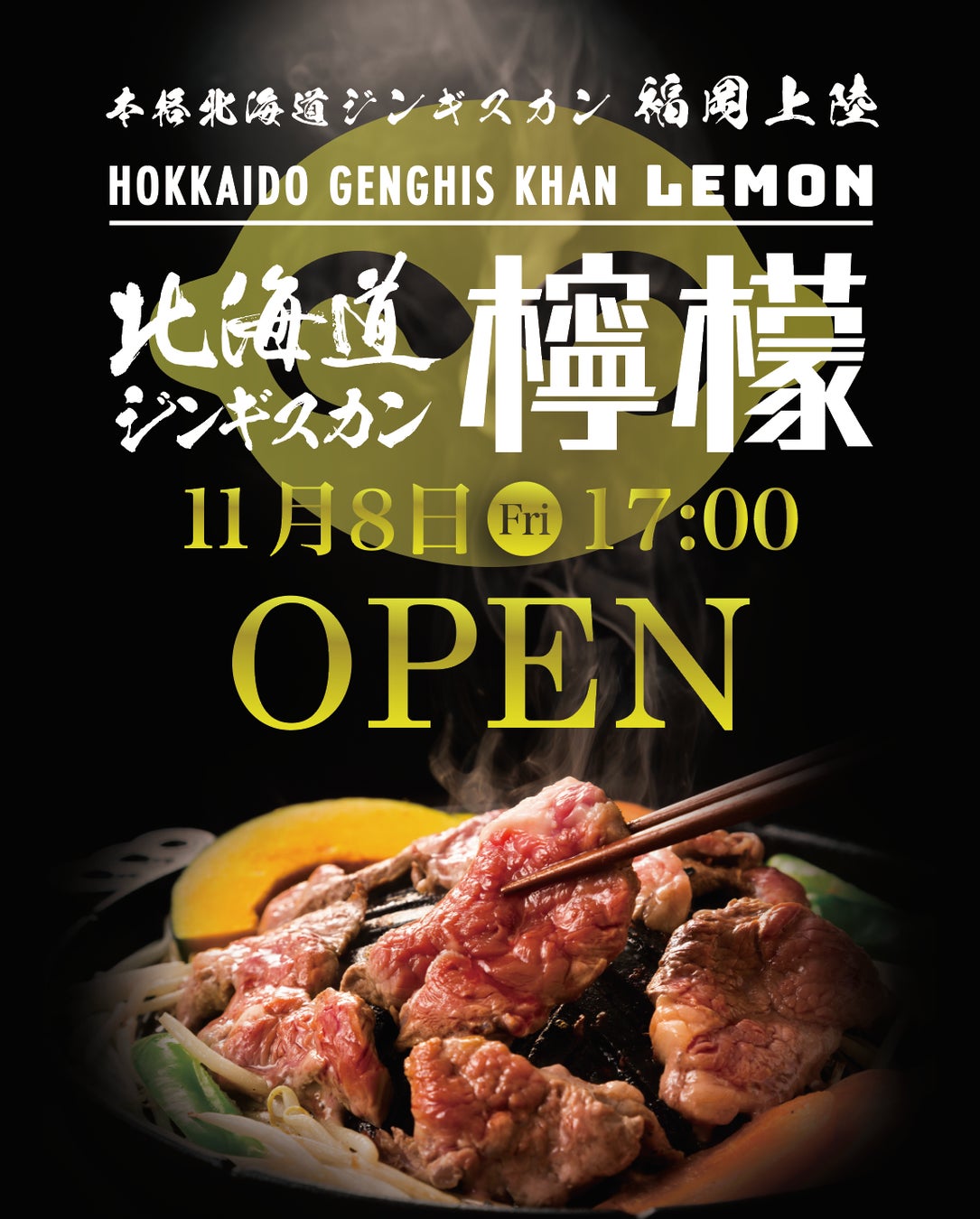 【福岡初上陸!】北海道発のジンギスカン専門店『北海道ジンギスカン檸檬(れもん)』が2024年11月8日(金)、フランチャイズ店舗として福岡市中央区にグランドオープン!
