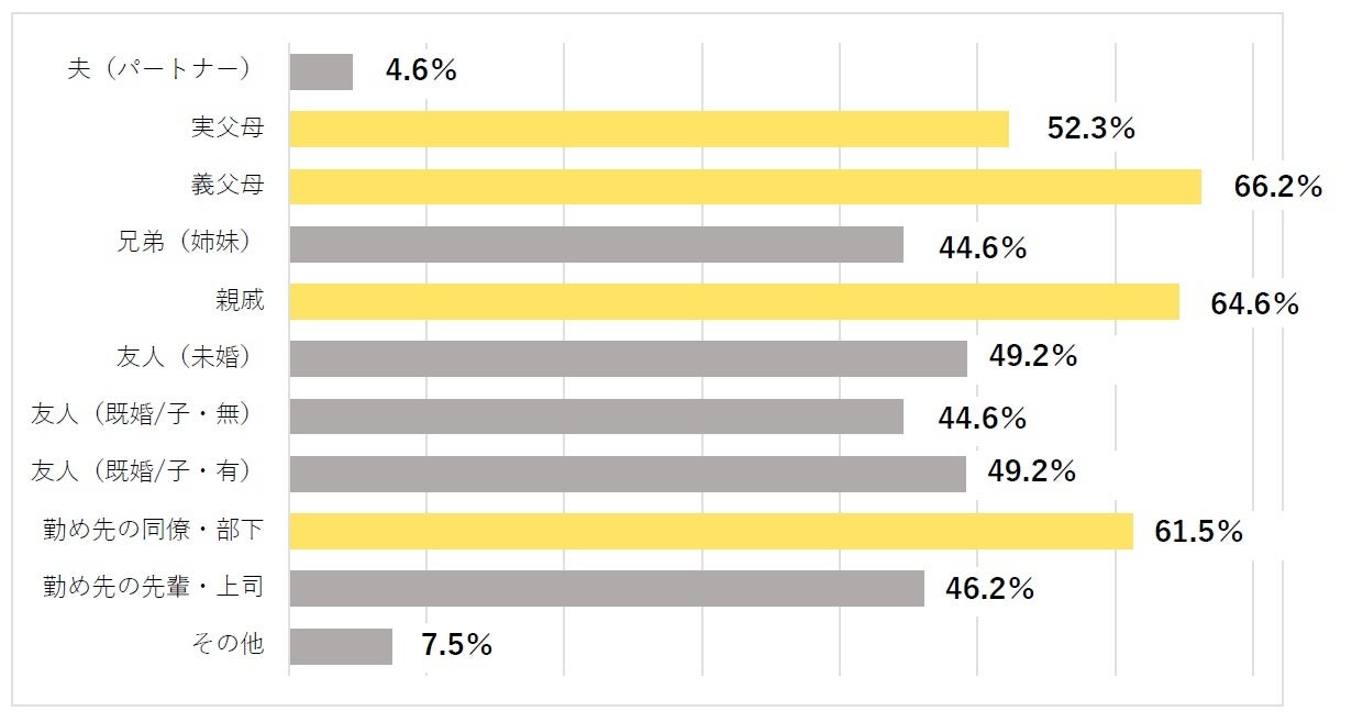 また、不妊治療をしていることを伝えていない相手(Q6)としては、「義父母(66.2%)」、「親戚(64.6%)」、「勤め先の同僚・部下(61.5%)」、「実父母(52.3%)」の順となり、勤め先の同僚・部下以外は親と親戚が上位を占める結果となりました。