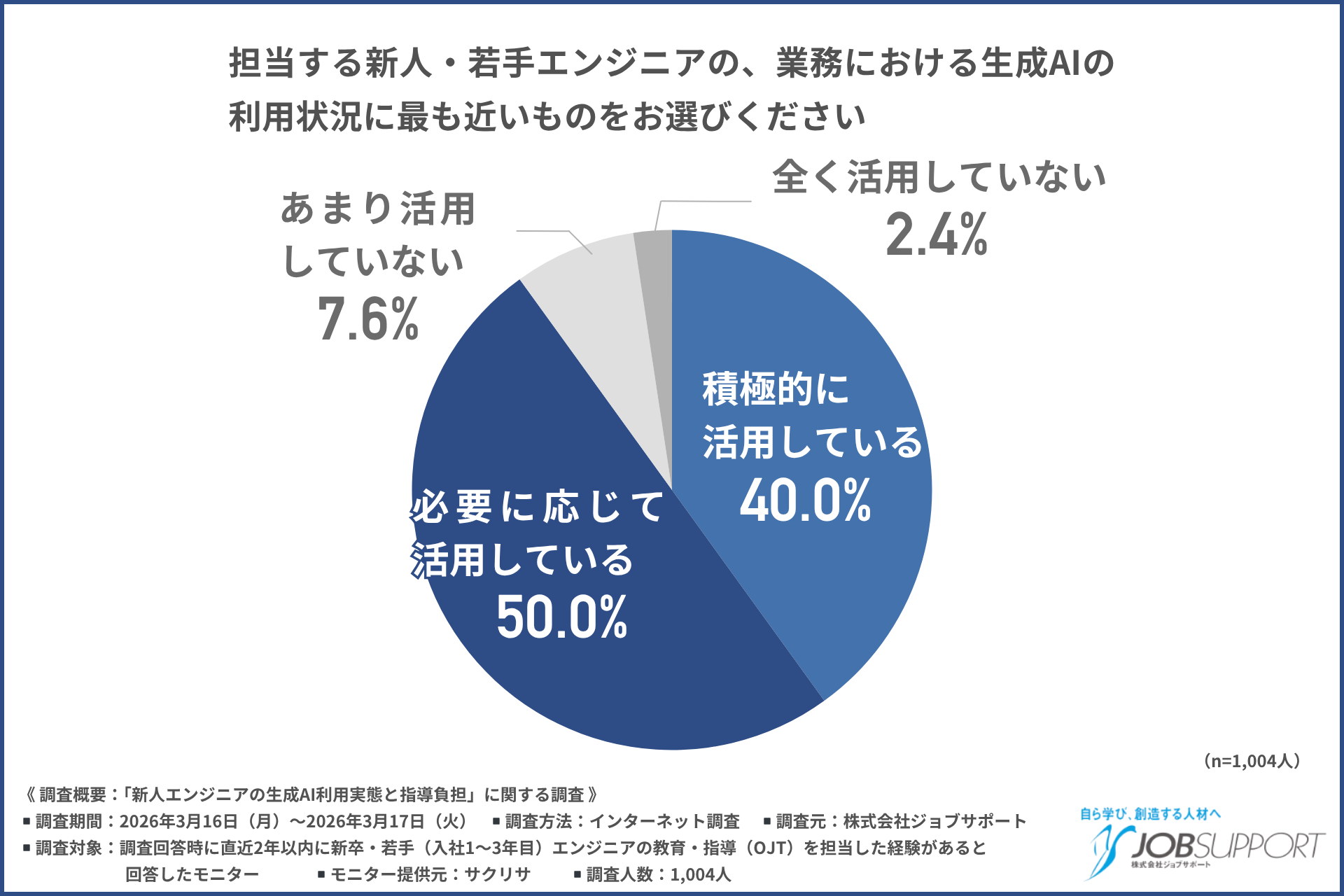 株式会社ジョブサポート(所在地:東京都千代田区、代表取締役:塚田 努)は、直近2年以内に新卒・若手(入社1~3年目)エンジニアの教育・指導(OJT)を担当した経験がある方を対象に、「新人エンジニアの生成AI利用実態と指導負担」に関する調査を実施しました。