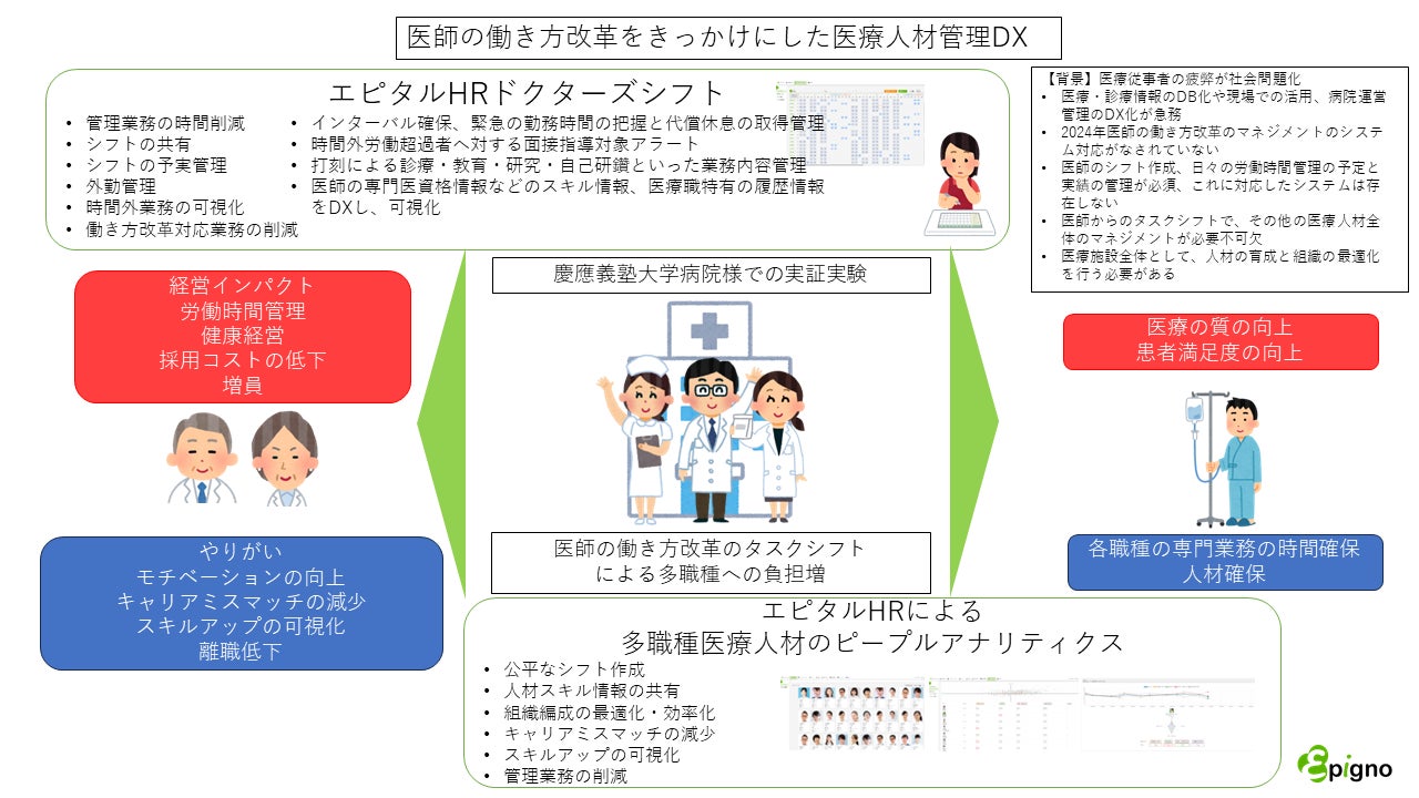 具体的には、エピタルHRドクターズシフトにより医師のシフトの AI 自動生成の精度を向上させ、医師特有の働き方に対応し、医師やクラークのシフト作成時間の短縮を図ります。シフトを院内で共有することで、どこに誰がいるのかオンラインで共有できます。予定情報であるシフトは、時間外労働時間規制に対応したインターバルが確保され、時間外労働時間、インターバル中の緊急の勤務時間の把握と代償休息の取得管理、時間外労働超過者へ対する面接指導対象アラート、打刻による診療・教育・研究・自己研鑽といった業務内容管理などを可能とします。慶應義塾大学病院にて実証を行ったのち運用にのせ、病院の勤怠システムと連携を目指します。
