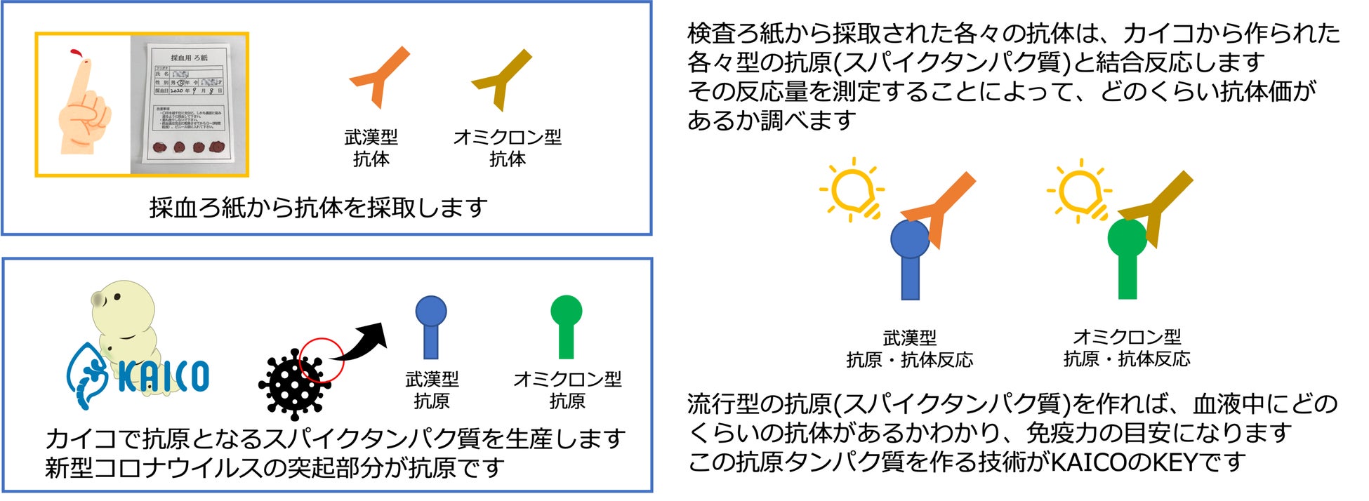 KAICOのコア技術は、カイコを利用した組換えタンパク質開発・生産の技術であり、本抗体測定サービスでは、新型コロナウイルスに対する抗体(返信された濾紙から回収)を、自社生産のスパイクタンパク質と反応、発色させ検出する抗体検査キットを用いて測定します。そのため自社生産のスパイクタンパク質を武漢型からオミクロン型に置き換えるだけで、オミクロン株への抗体が測定可能になります。今後も新規株に対するワクチンが市場に出る際には対応して行く予定です。