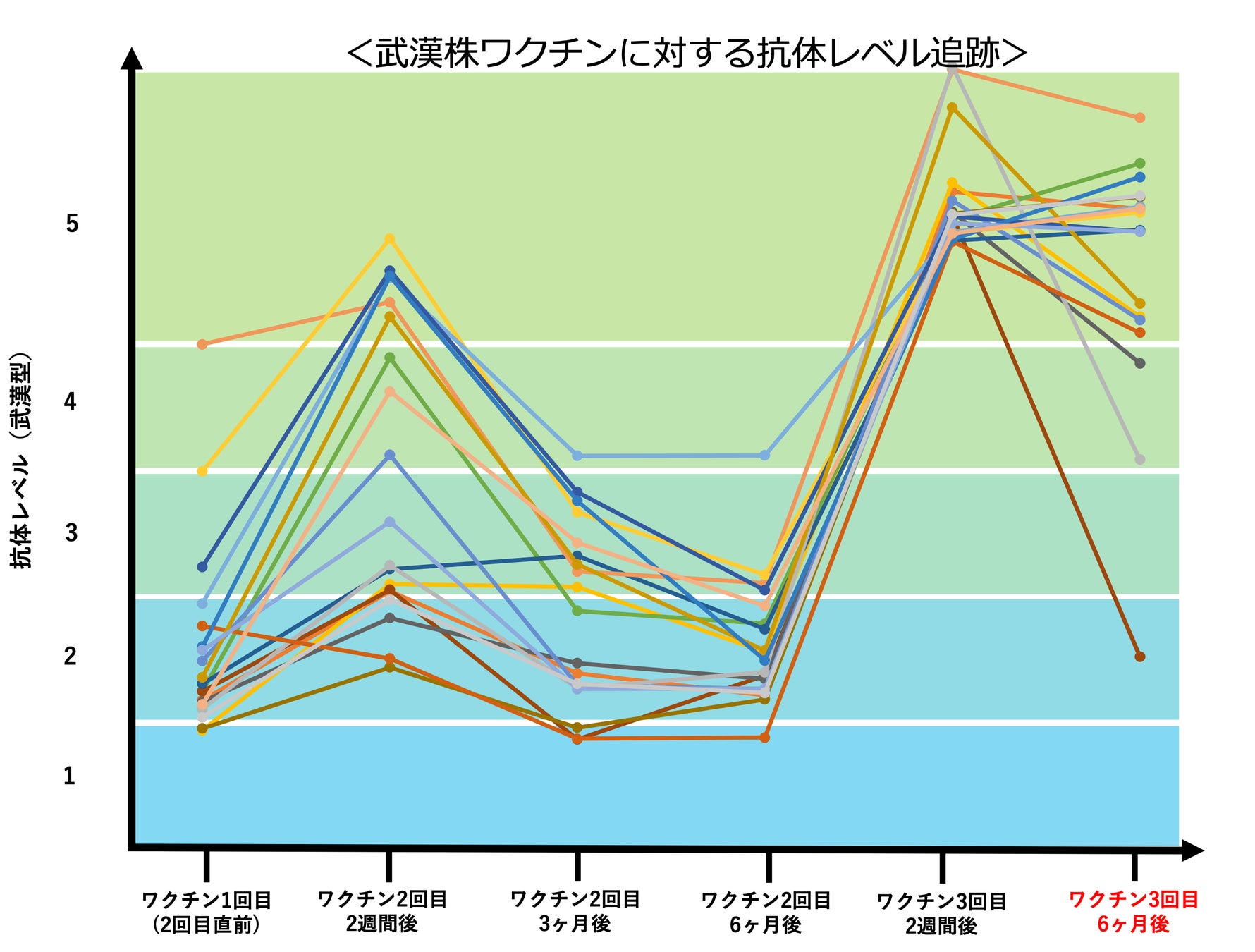 性能試験のために協力者27名の抗体レベルを評価しています。この追跡データではワクチン接種後の獲得抗体価や、その後の抗体価の減少に個人差があることが見られます。このデータを見るとワクチン3回接種すると武漢株に対する抗体価が個人差なく上がっていますが、その後の経緯から抗体価の保持状況は個人差が大きく見られます。今後再び海外旅行を楽しむようになった時には、現地での重症化リスクを避けるためにワクチンの接種が望まれますが、接種後のワクチンの免疫効果がどのくらい保持できているかの目安にご利用できます。