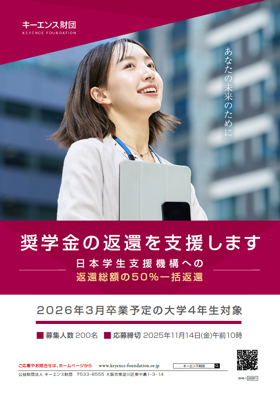 キーエンス財団では、来年2026年3月に卒業を控えた大学4年生を対象とした「貸与奨学金の返還支援」の募集を今年も行います。