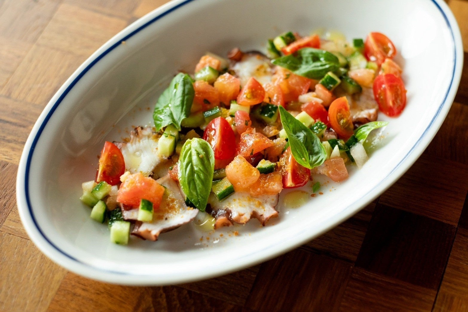 沖縄の食文化は、中国など外国の影響を多く取り入れた宮廷料理と、地元の食材を用いて医食同源の考え方を取り入れた庶民料理が混ざり合い受け継がれてきました。OCTOの料理のベースとなる地中海の食文化も、地中海で採れる魚介類や野菜などの豊かな食材と交易を介して入ってきた中近東などの食文化が混ざり合い発展したもの。OCTOでは、フランスでの修業経験を持ち、トマトを使った料理や中国料理の技法を学んだ料理長とイタリア人ピッツァイオーロが、共通点のある2つの食文化をクロスさせた「地中海グリルキュイジーヌ」をご提供します。