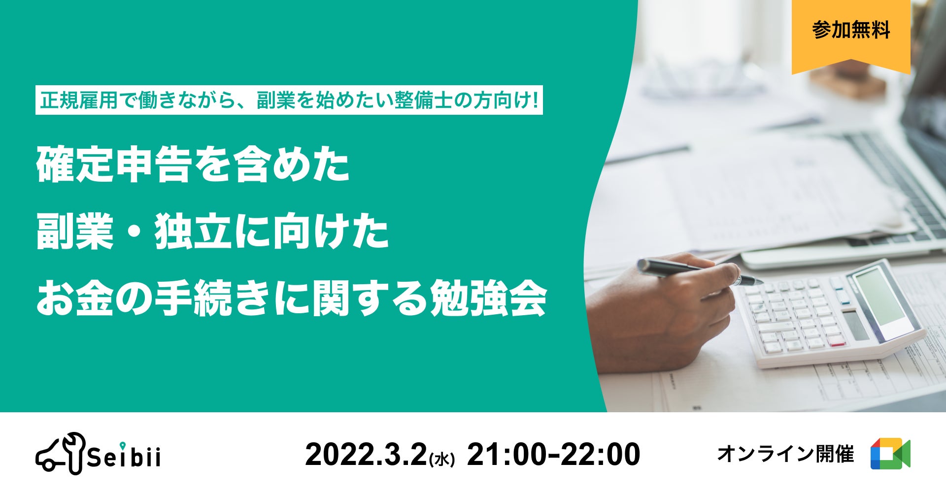 自動車の整備・修理出張サービス「セイビー」の開発・運営を行う株式会社Seibii(本社:東京都港区、代表取締役CEO:佐川 悠、以下、Seibii)は、2022年3月2日(水)21:00より全国の整備士向けに「確定申告を含めた副業・独立に向けたお金の手続きに関する勉強会」を開催することをお知らせします。