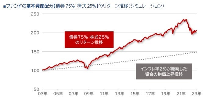 基本の資産配分「債券75%:株式25%」は、長期のリターン推移において、日銀の物価上昇目標(前年比+2%)を上回っており、リスクを抑えながらもインフレに負けないリターンが期待できる比率と考えられます。