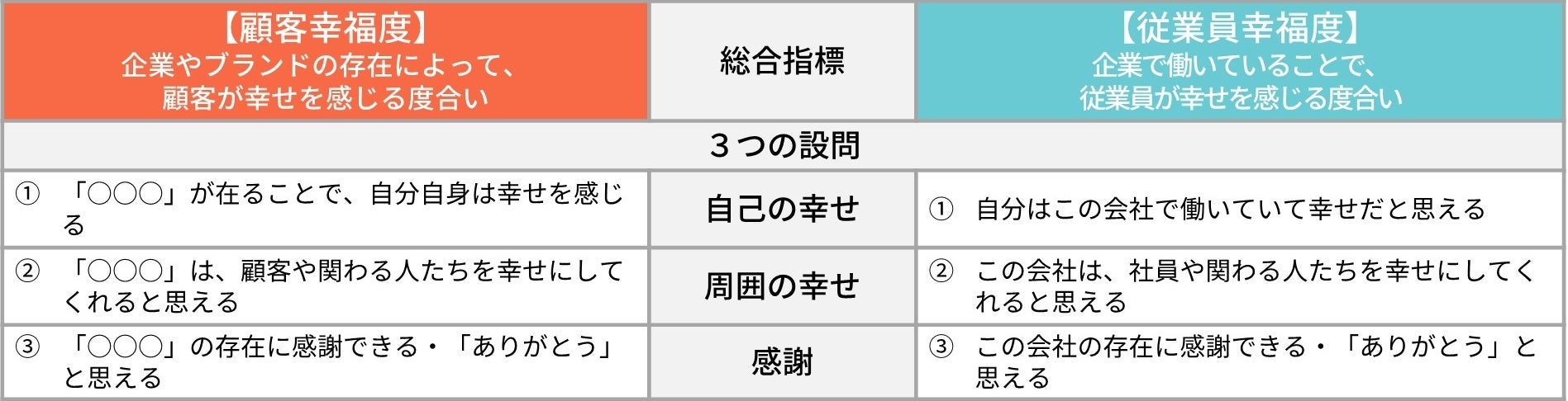 『顧客幸福度』と『従業員幸福度』を「自己の幸せ」「周囲の幸せ」「感謝」の3問で測り、数値化しました。