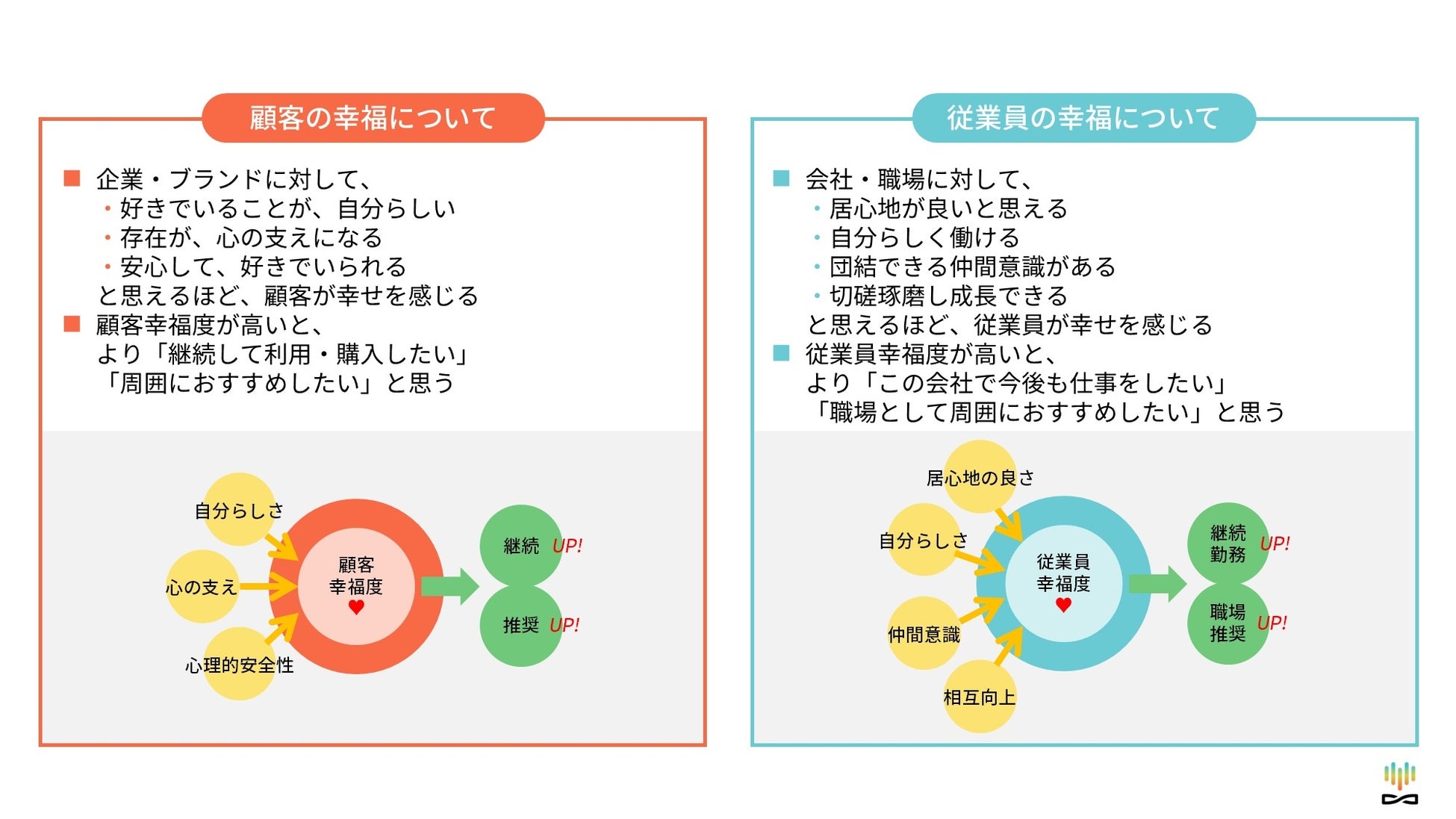 また、これまで『顧客満足度』や『従業員満足度』については多くの企業が取り組まれてきたと思いますが、『幸福度』に着目していくと、「自分らしさ」や「心の支え」「仲間意識」など、これまで気づかなかった要素が企業やブランドを支えてくれていることが分かりました。