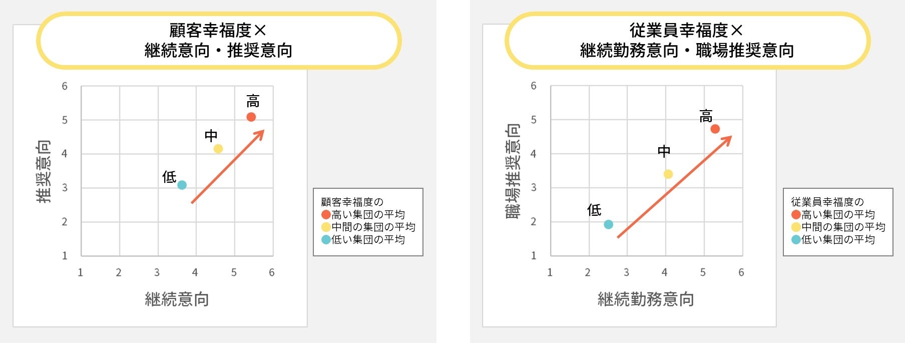 『顧客幸福度』が高いほど、“サービスや商品を今後も利用・購入し続けたい”といった『継続意向』や、“親しい人たちにおすすめしたい”といった『推奨意向』が高いことが分かりました。また、『従業員幸福度』が高いほど、“この会社でこれからも仕事がしたいと思える”といった『継続勤務意向』や、 “この会社で働くことを周囲におすすめしたい”といった『職場推奨意向』が高いことも分かりました。