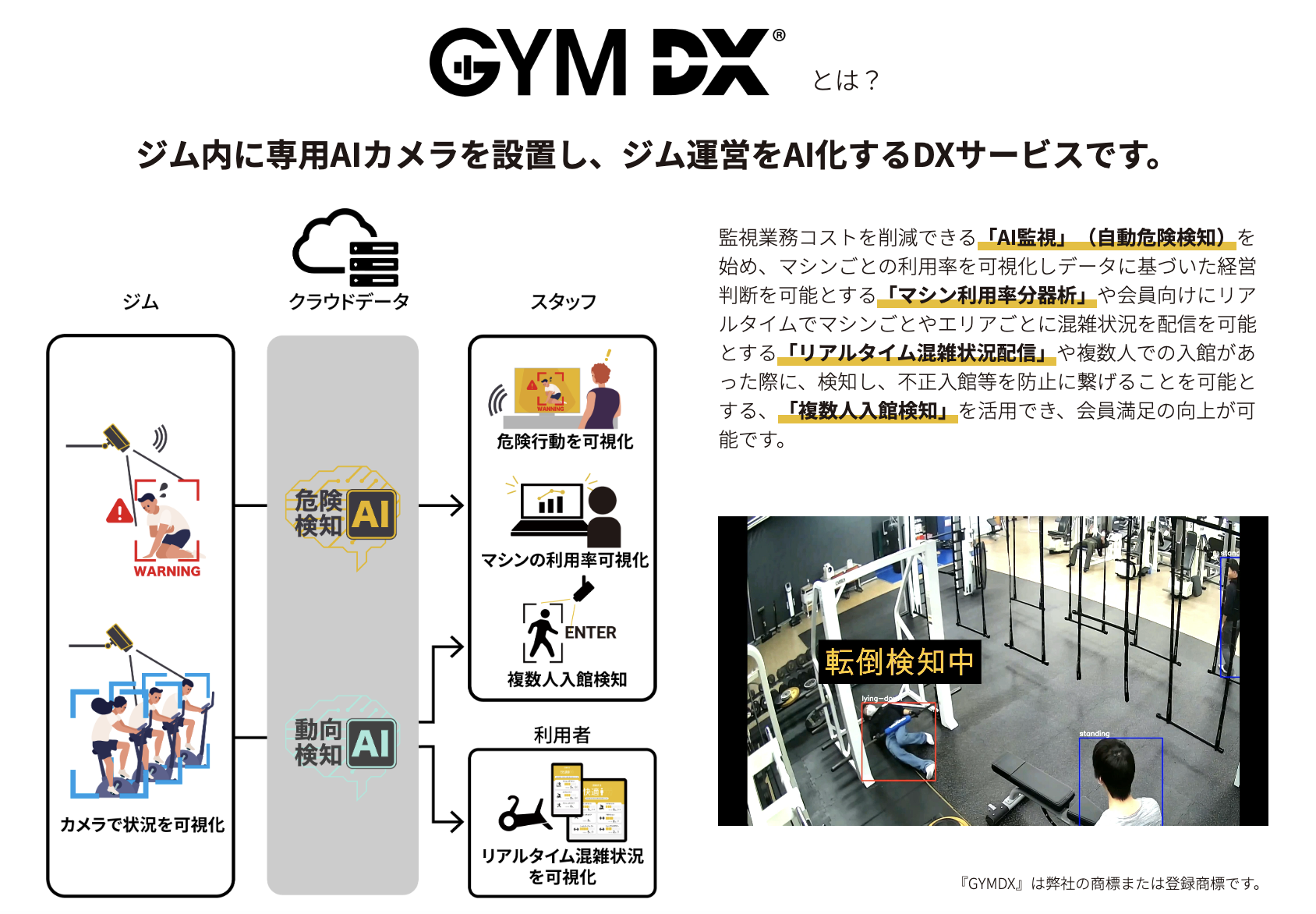 ジム内に専用カメラを設置し、ジム運営をAI化するDXサービスです。