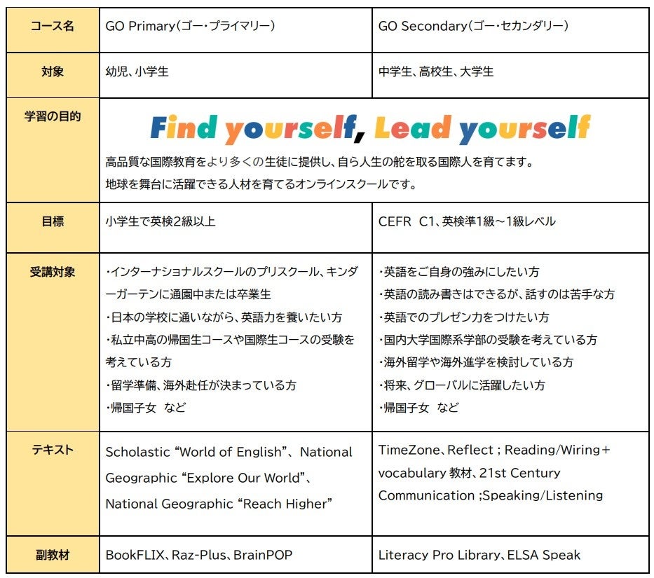 この度、「地球を舞台に活躍できる“バイリンガル国際人”」を目指すことをミッションとして、初心者レベルから海外正規留学レベルまで幅広い英語力に対応した、中高生・大学生向けのコース「Go Secondary(ゴー・セカンダリー)」を新たに開講いたします。