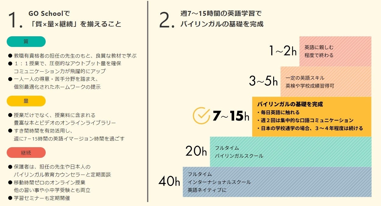 GO School は、日本初のオンライン大学を設立した BBT と、アオバジャパン・インターナショナルスクール・グループのノウハウを集結した、オンライン英語バイリンガルスクールです。” 世界水準の学び” で、グローバル時代で活躍する” バイリンガル国際人” を育てることを目標に掲げています。英語初心者から帰国子女まで、英語レベルに応じた個別最適化されたレッスンや、英語で学べる多彩な科目を受講することができます。厳選された教師による個別×担任制指導、生活スタイルに合わせた学習習慣を身に付けるための日時固定制を導入、さらに、担任やバイリンガル教育アドバイザーとの個人面談で、バイリンガル教育をフルサポートします。https://www.go-school.net/