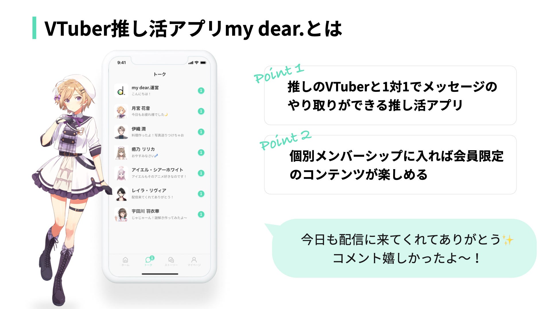提携バーチャルタレント様には、ファンの方々へ特別なメッセージを送信できるVTuber推し活アプリ「my dear.」をご利用いただけます。
