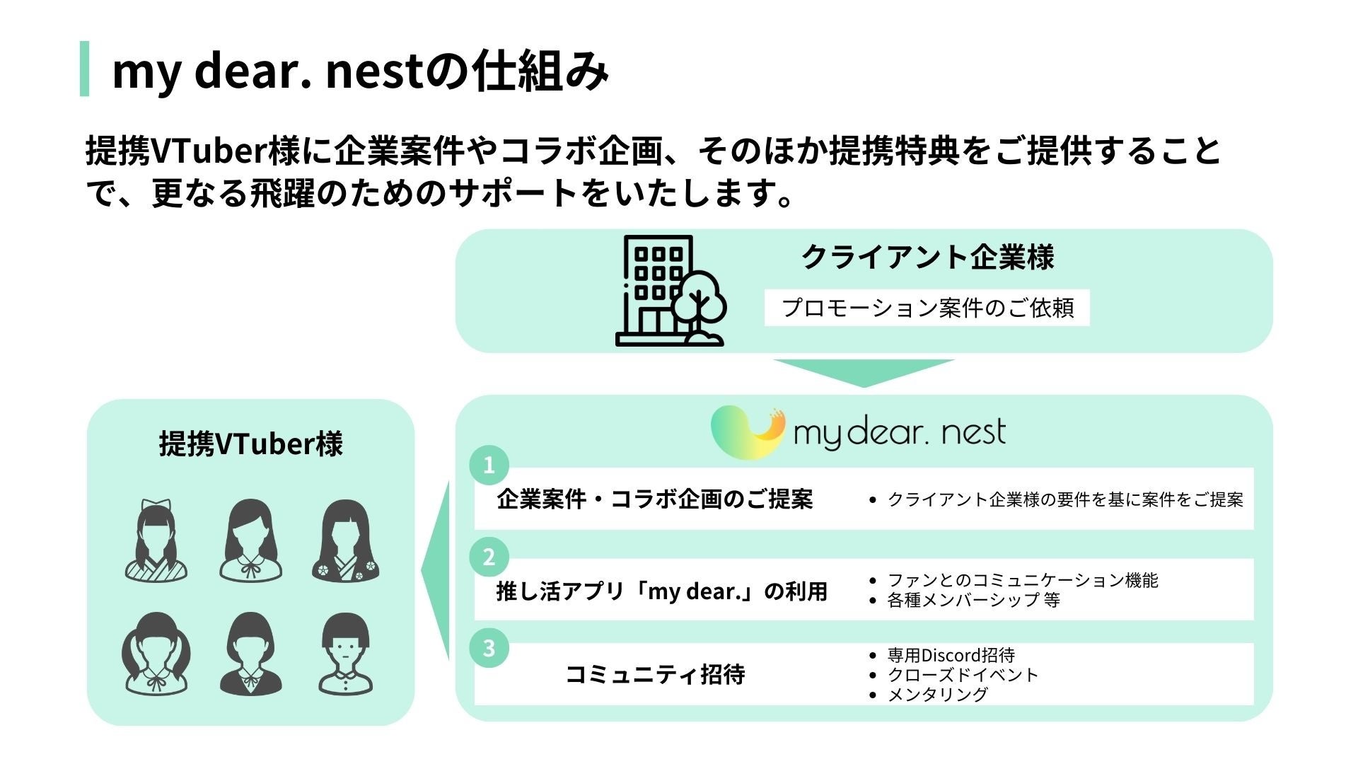 このような企業案件の継続的な増加に伴い、個人活動・他事務所所属を問わず、広くVTuberの方々へ案件のご提案や各種サポートを提供するためのサポートプログラム「my dear. nest」を設立いたしました。