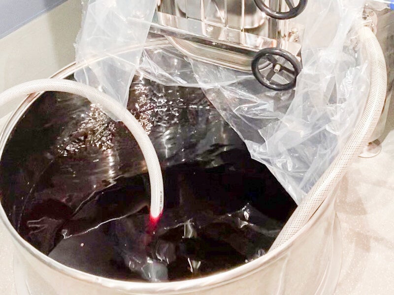 博多ワイン醸造所で6月13日より醸造を開始した、チリのカベルネ・ソーヴィニヨンのプレス作業が、6月24日~25日で行われました。プレス作業とは、アルコール醗酵後のブドウをプレス機で圧搾し果汁を絞る工程のことです。2基のタンクで醗酵させていた1,075kgのブドウの果汁絞りです。