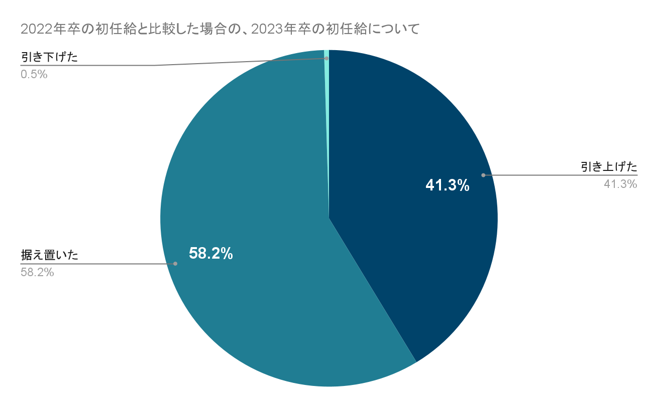 22年卒と比較して、初任給を引き上げた企業と据え置いた企業は99.5%とほぼ全体を占める結果となった。