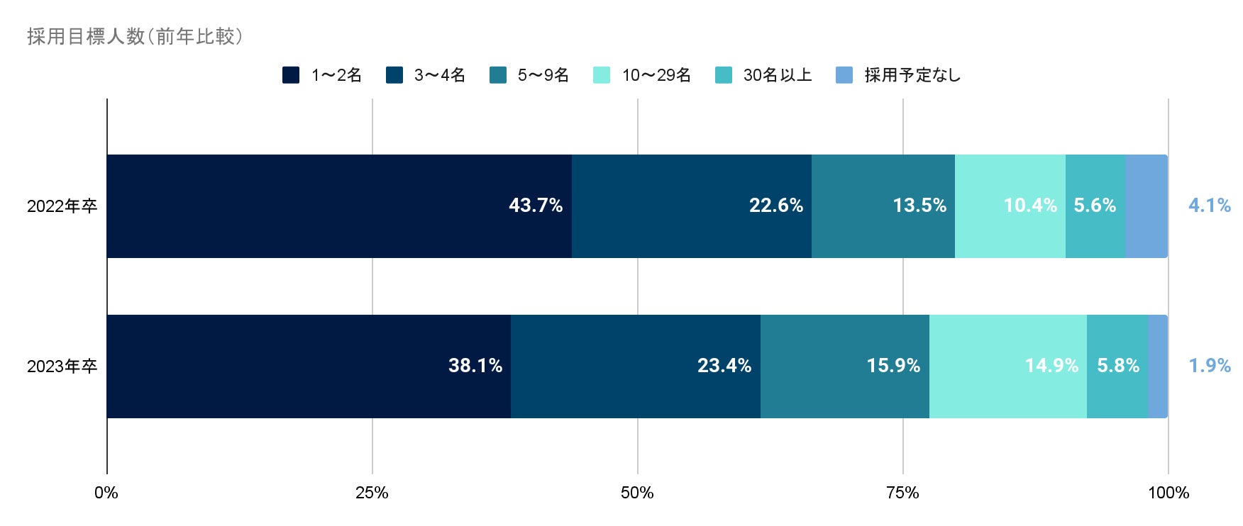 10〜29名採用の企業が4.5ptアップ、5〜9名採用の企業が2.4ptアップ。