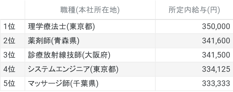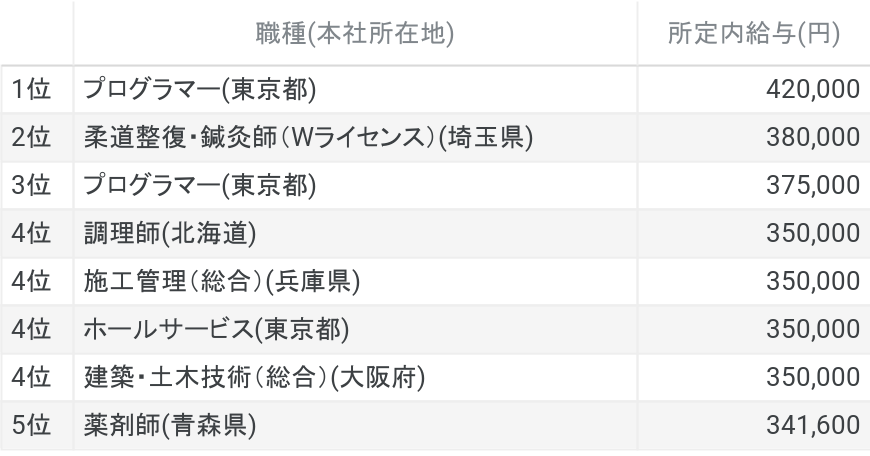 - 初任給 職種ランキングベスト5に調理・建設分野がランクイン。