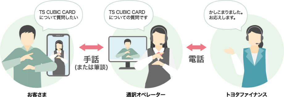 本サービスでは、耳や聞こえないお客様からトヨタファイナンス発行のクレジットカードや自動車クレジット等に関するお問い合わせを、当社通訳者が手話や筆談にて受け付けます。その内容をトヨタファイナンスの各デスクに電話を繋げたのち、お客様とトヨタファイナンス各デスクのやりとりをリアルタイムで通訳いたします。