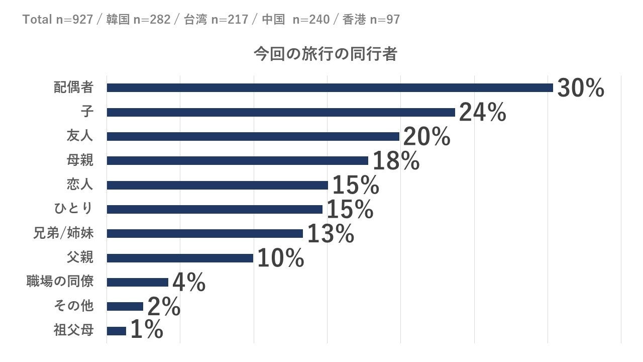 ・旅行の同行者は「配偶者(30%)」「子ども(24%)」と家族旅行がTOPとなっており、次いで「友人(20%)」「母親(18%)」「恋人(15%)」「ひとり(15%)」と続く。
