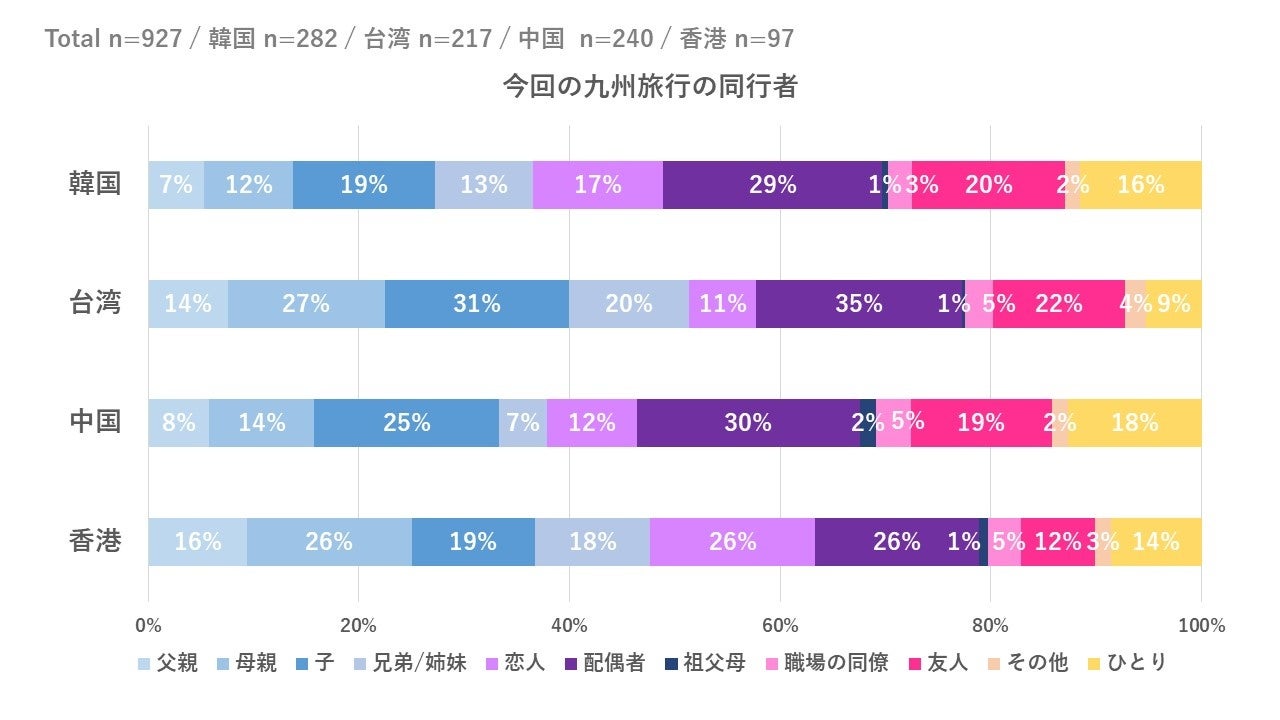 香港エリア来訪者は「父親(16%)」、「母親(26%)」など両親との旅行割合が高く、「恋人(26%)」との旅行割合も顕著に高い。