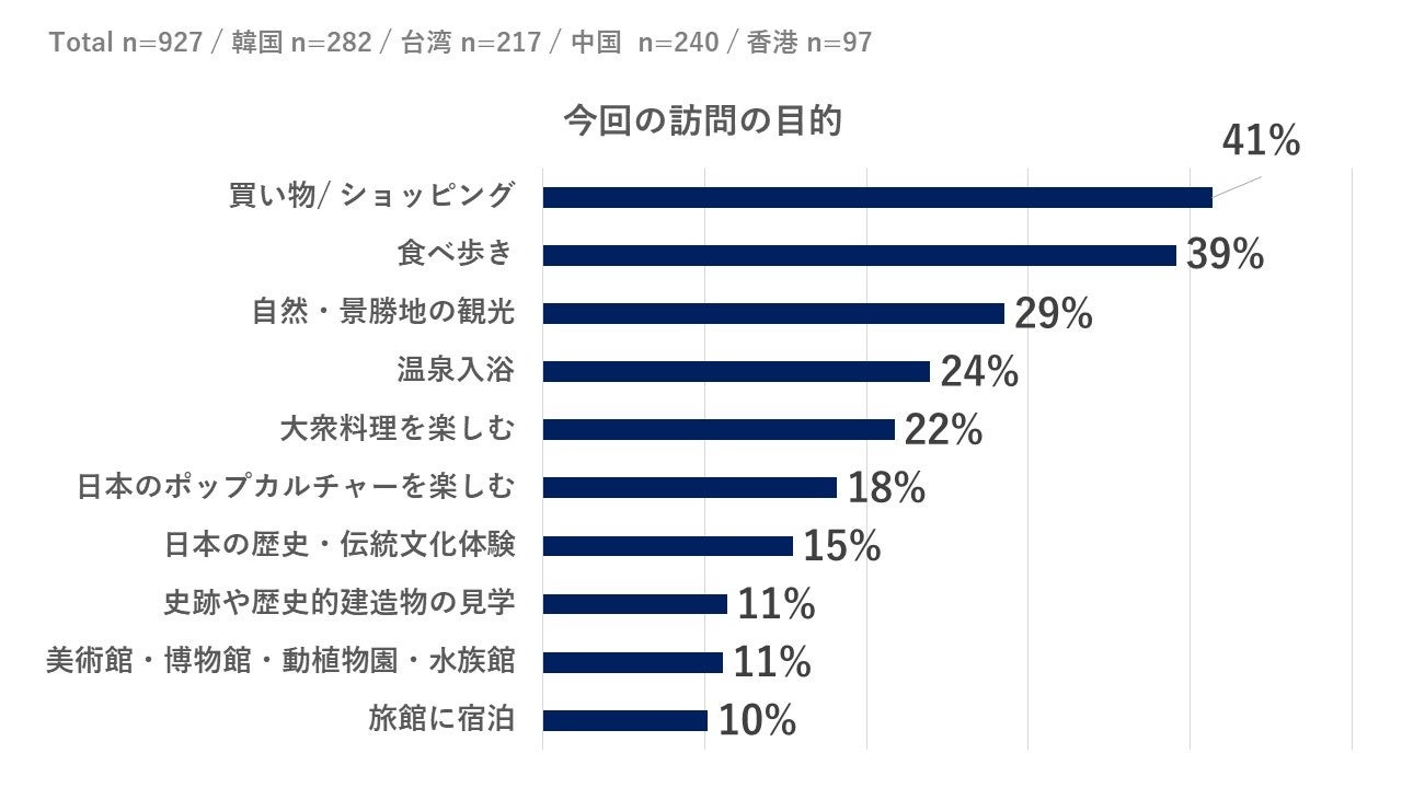 ・旅行目的は「買い物/ショッピング(41%)」、「食べ歩き(39%)」などの都市型観光がTOPな一方で、「自然・景勝地の観光(29%)」「温泉入浴(24%)」などの目的型観光が続く。「日本のポップカルチャーを楽しむ(18%)」が高ランクにつけており、コンテンツ型観光にも集客が見込めるポテンシャルがある。