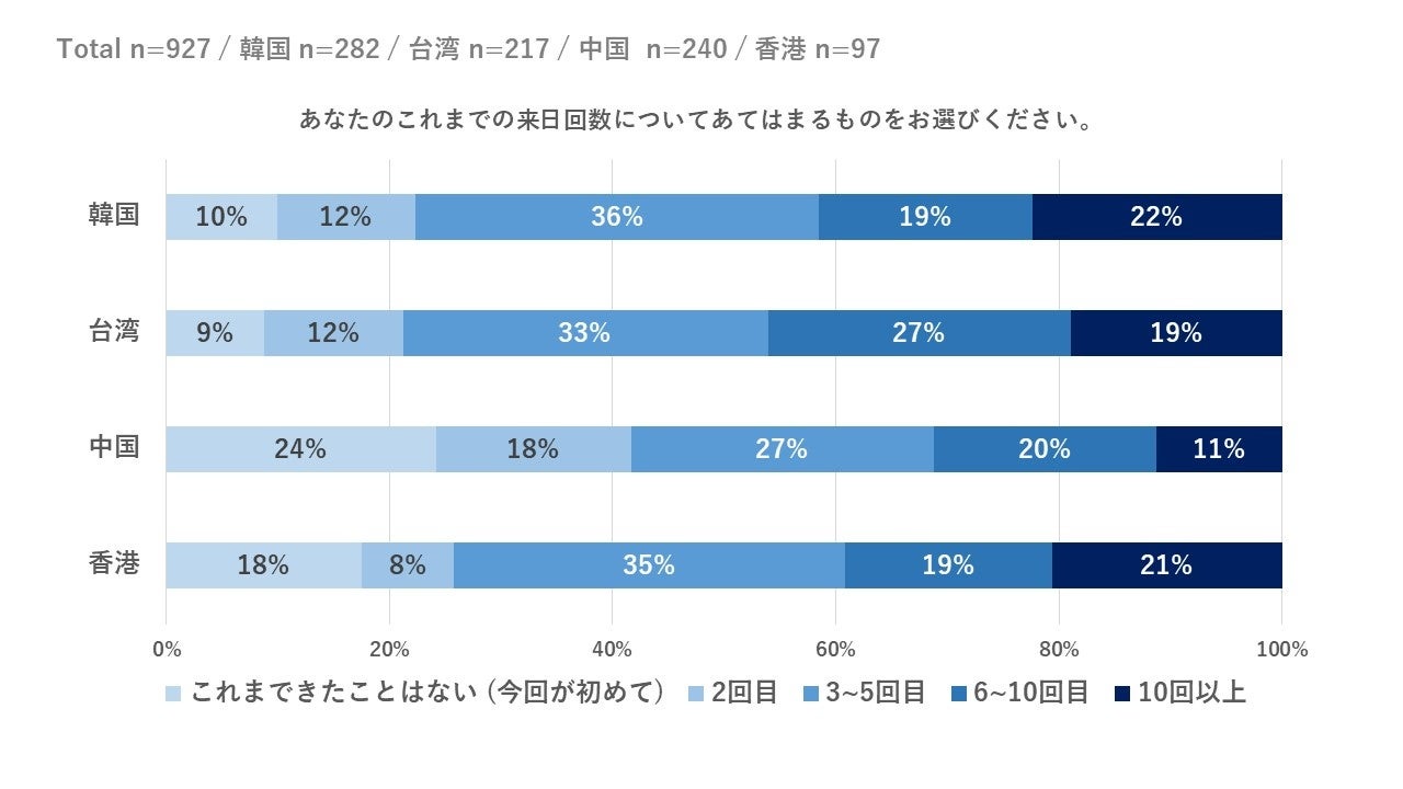 香港エリア来訪者は「今回が初めて(18%)」という回答と「10回以上(21%)」という回答比率が4エリアのなかで高い。