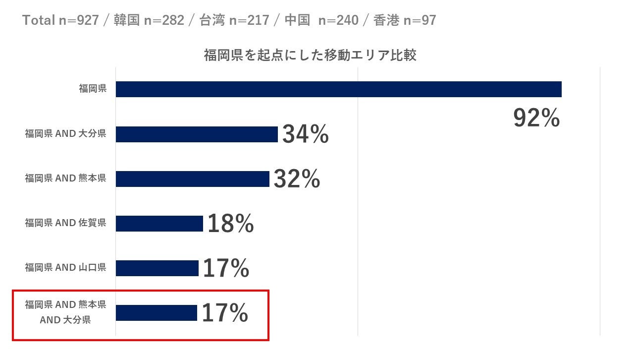 福岡県を起点としたそれぞれの都道府県への訪問率を見てみると、「福岡県⇔大分県間での移動(34%)」、「福岡県⇔熊本県間での移動(32%)」が多く発生していることが推察される。また、相互間移動だけではなく「福岡県」「大分県」「熊本県」を実際にトライアングルで周遊している旅行者も17%となっている。