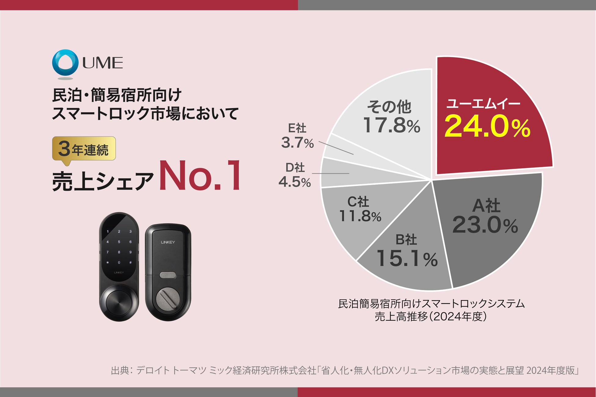 株式会社ユーエムイー(東京都港区/代表取締役:内野 雅和、以下当社)は、デロイト トーマツ ミック経済研究所が発行した市場調査レポート「省人化・無人化DXソリューション市場の実態と展望 2024年度版」において、2022年度から2024年度の3年連続で、民泊・簡易宿所向けスマートロック市場における売上高シェアNo.1を獲得したことをお知らせいたします。