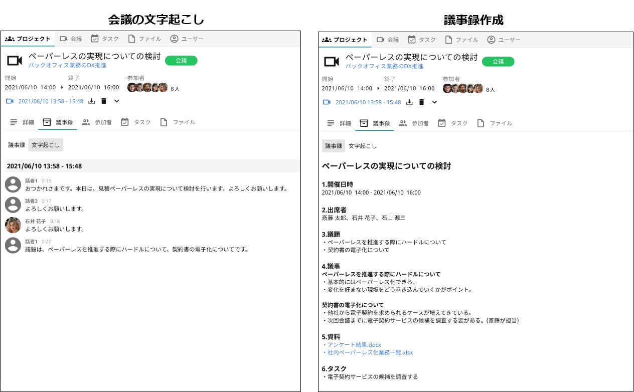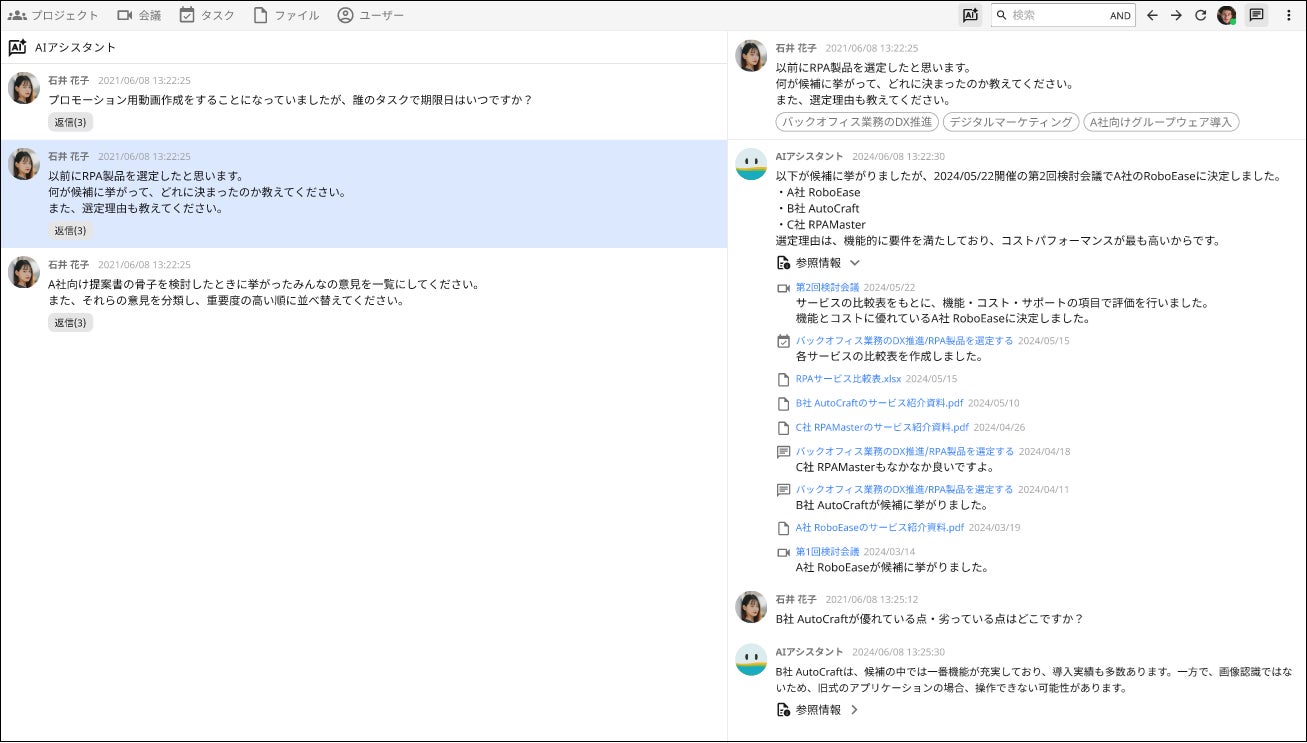 さらに、音声データがテキスト化されることで、AIアシスタントが過去の会議内容を参照できるようになります。これにより、重要な議論の内容や決定事項を「組織のナレッジ」として効果的に活用できるようになります。