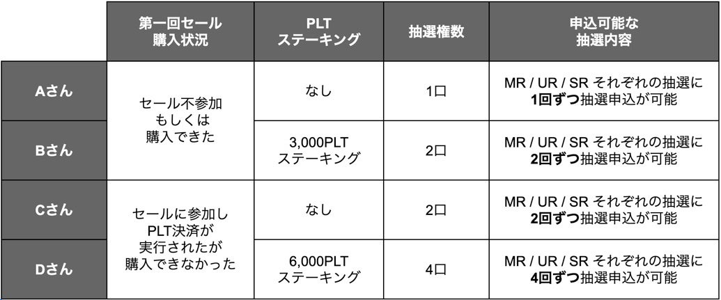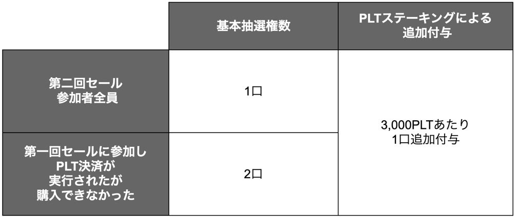 全ての方に付与される「抽選権1口」に加え、第一回のセール時にPLT決済を実行したがNFTの購入ができなかった方には「抽選権1口」を追加付与します。対象者には合計2口が付与されます。