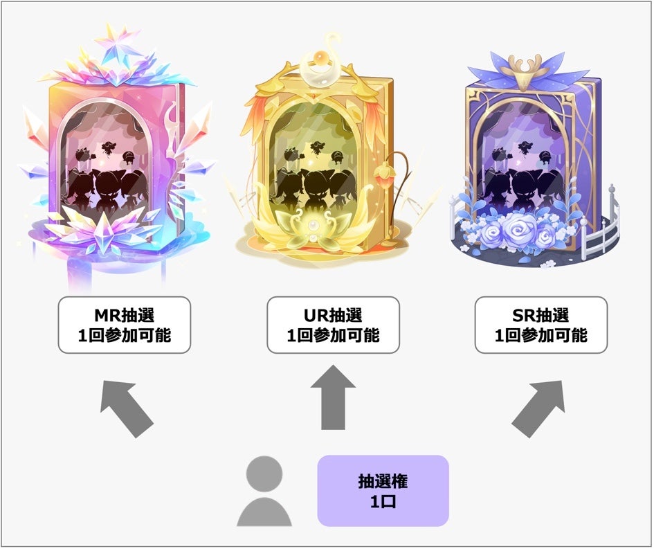 今回のセールでは全ての方に「抽選権1口」が付与されます。「抽選権1口」につき、MR / UR / SR の各抽選に1回ずつ参加できます。