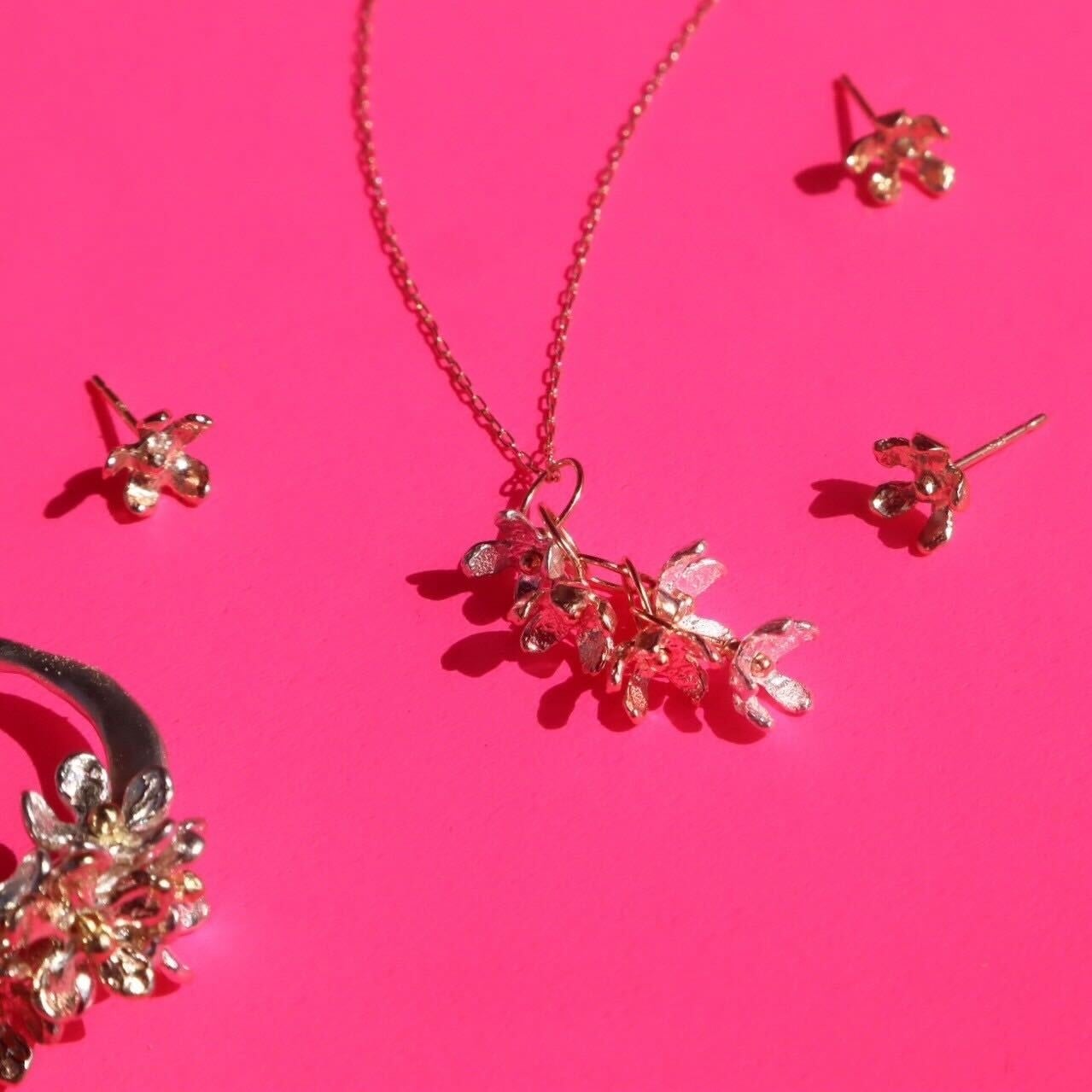 ブランドを代表する紫陽花リングやボタニカルリングと同様、まるで生け花のように、お花をワイヤーでひとつひとつ職人が手作業でつけて制作していくかすみ草。